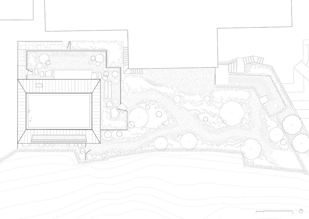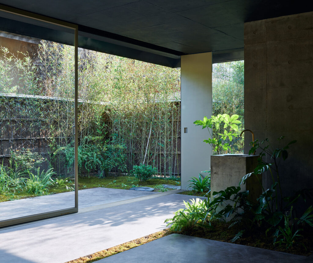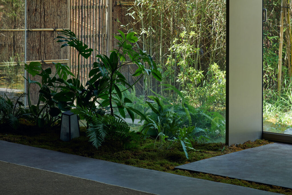 On the ground floor, two distinct courtyards are articulated. The outer courtyard is bright and extroverted, shaped by a winding path that moves through dense, saturated planting toward the pavilion’s entrance. The inner courtyard at the rear is shaded and introspective, offering a quieter spatial counterpoint. The lounge itself is enveloped by vegetation, with plants carefully calibrated in scale and composition alongside architectural elements. Together, landscape and building components are perceived as a single, uniform entity.