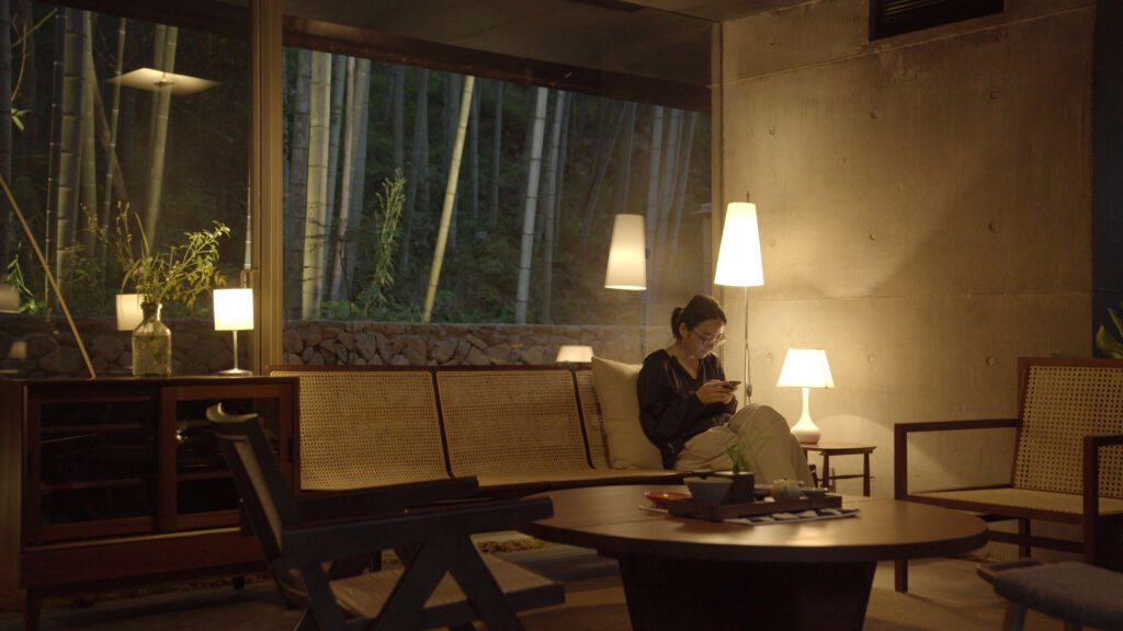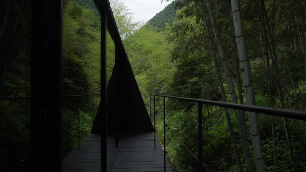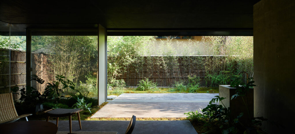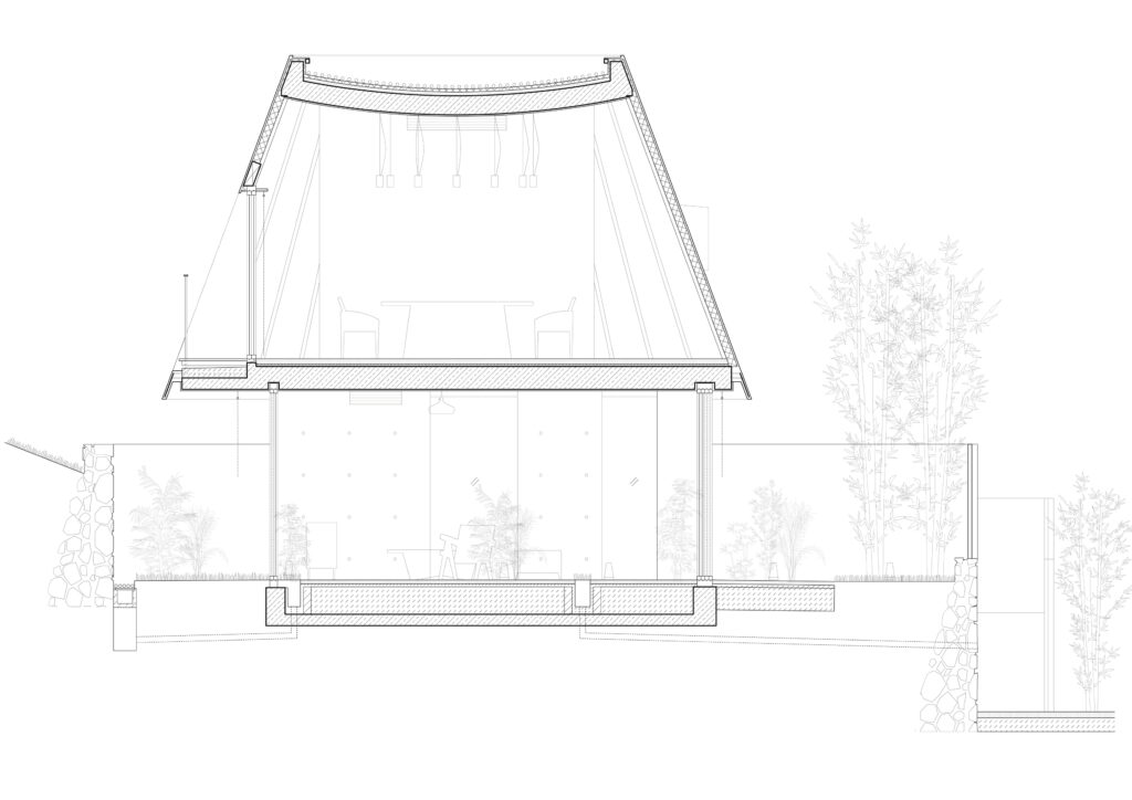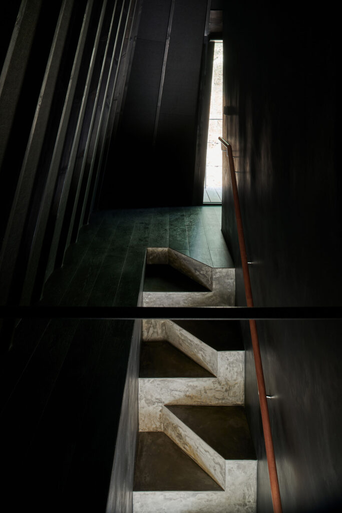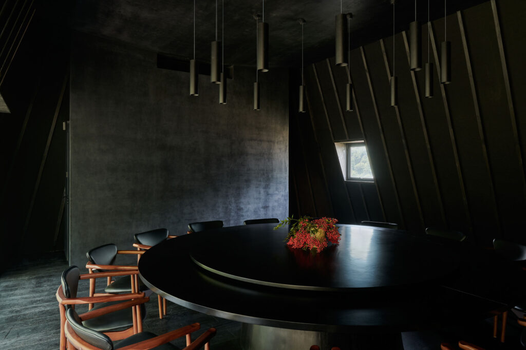 The transition to the second floor introduces a markedly different atmosphere. Upon ascending, visitors are enclosed by a clearly defined form, perceived under dim, controlled lighting. During meals, illumination is restricted to the dining table alone, isolating the act of dining from its surroundings. Through the window frame, only a fragment of the adjacent bamboo grove is visible—cropped in such a way that it loses scale and continuity, transforming into an abstract, almost pictorial element.